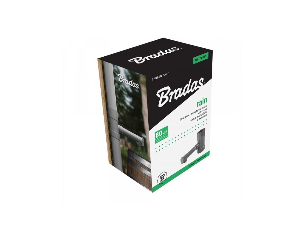 BRADAS sběrač děšťové vody s ventilem je redukce pro okapový svod, který lze použít pro svodové rubky z PVC a kovu o průměru 80 mm. Je vyroben z vysoce kvalitního ABS plastu a díky snadné montáži a ventilu s regulací průtoku vody je ideálním řešením na otázku, jak efektivně zachytit dešťovou vodu.