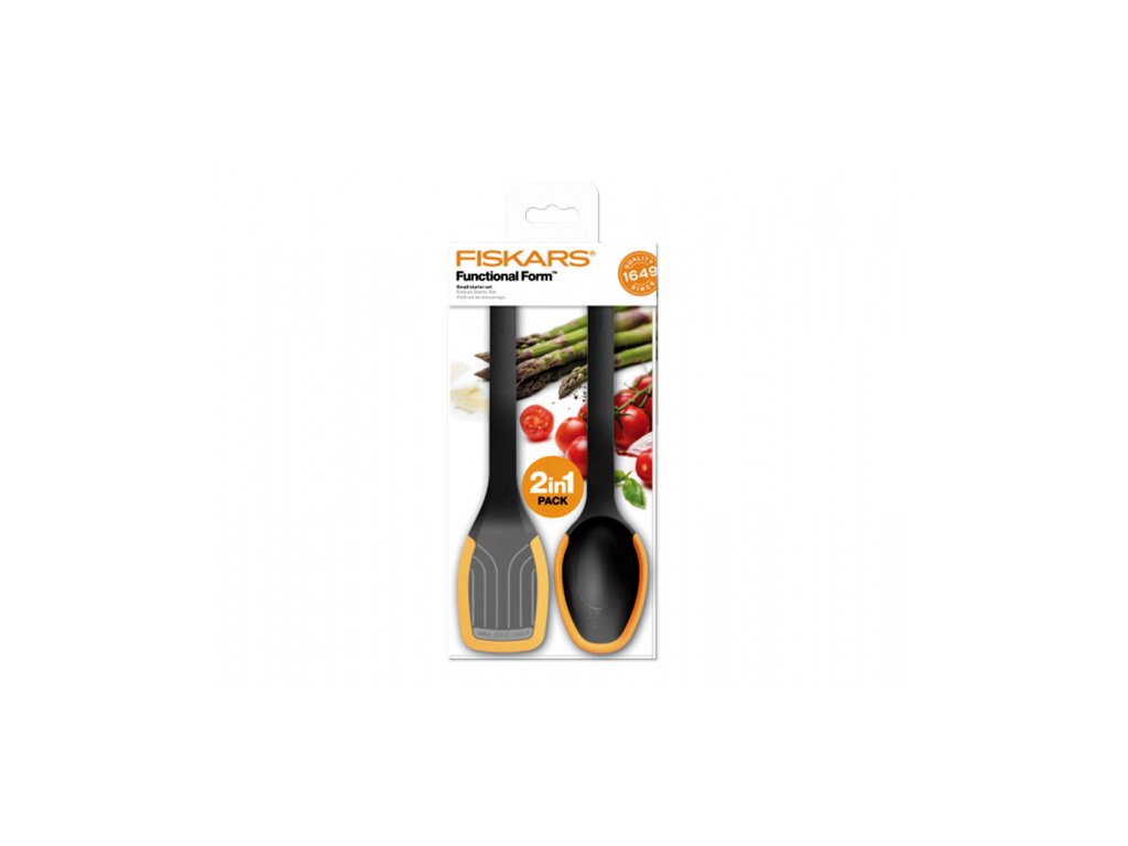Set se skládá z 2 ks Fiskars domácích potřeb: lžíce a lopatky. Lžíce má pružné silikonové okraje pro snadné vytření každého nádobí. Lze ji využít jako měrku pro 1 lžičku, 1 lžíci a 0,5 dl. Výška: 372 mm, délka: 40 mm, šířka: 80 mm, hmotnost: 80 g. Lopatka má praktické pružné silikonové okraje pro snadné použití. Výška: 373 mm, délka: 49 mm, šířka: 80 mm, hmotnost: 70 g.