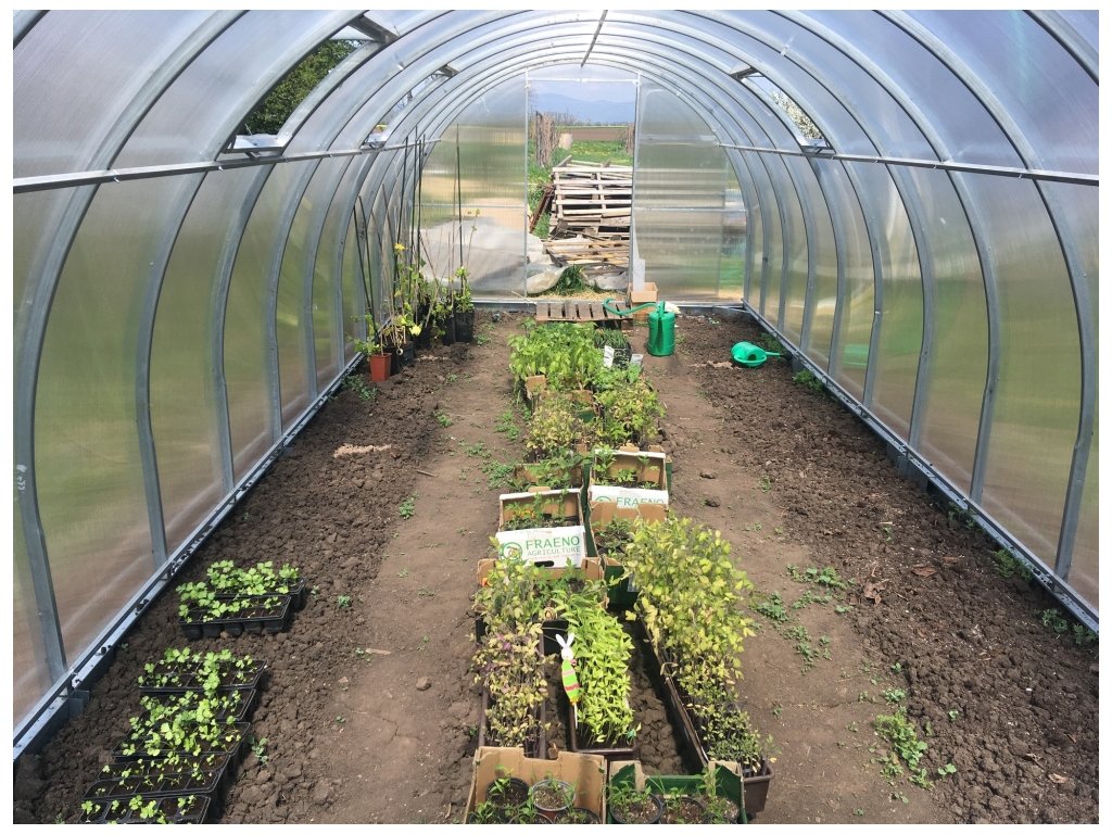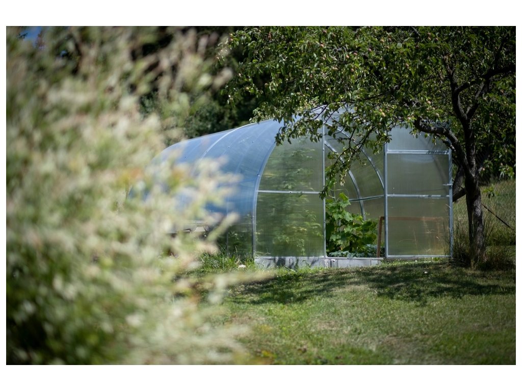Skleník má dvoje dveře, ve kterých jsou umístěna ventilační okna /na protilehlých stranách/.