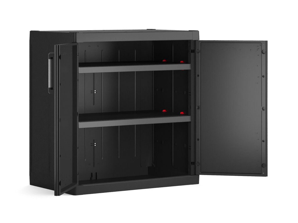 Skříň obsahuje celkem 2 přídavné police - každá s výraznou nosností až 25 kg, které přijdou vhod pro výrazně těžší předměty všeho druhu. Lze ji tedy využít pro skladování dílenského nářadí či zahradnických potřeb, kdy přijde vhod pro uložení náčiní, které by se jinam nevešlo. Díky svému provedení v neutrální černé barvě zapadne do každého prostoru bez ohledu na jeho konceptuální styl.