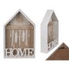 Dřevěná bílo-hnědá skříňka na klíče k zavěšení na zeď. Skříňka je zdobená vzorem lapače snů a dřevěným nápisem HOME.