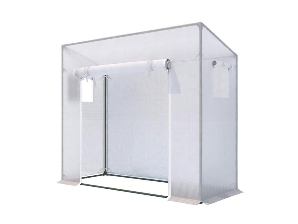 Fóliový stan pro pěstování sazenic, květin, bylinek, rajčat atd. Kryt je vyroben z odolné fólie, která udržuje teplotu, chrání rostliny před mrazem, větrem a prudkým deštěm. Specifikace: strop stanu se směrem dozadu snižuje (výška stropu v zadní části je 148cm) lehká, stabilní ocelová konstrukce (průměr trubky 17mm) vchod uzavřený na zip celkové rozměry (šířka / hloubka / výška): cca. 200x78x170cm 2 okna o rozměru 30x30cm rozměry vchodu: 120x135cm (šířka x výška) materiál PE 140 g / m2 kotvy a montážní lana součástí balení rozměry krabice: 87x10x22 Množství na paletě: 61 ks