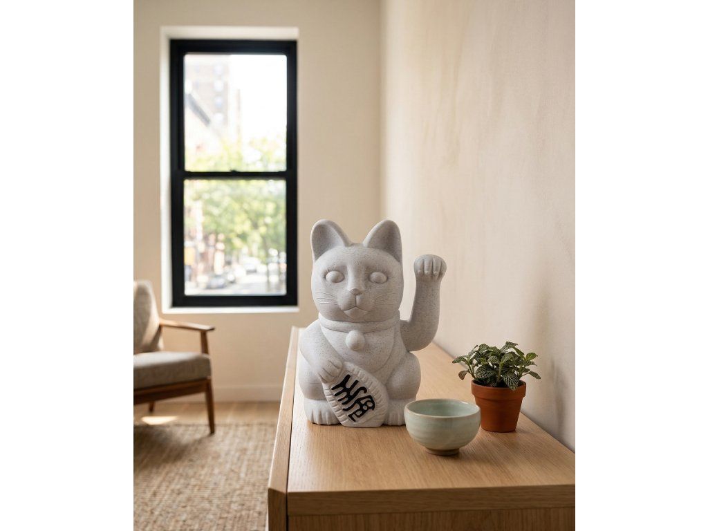 Tato stylová figurka Maneki Neko, známá také jako "vítací kočka", je víc než jen dekorace. Podle japonských tradic přitahuje svou zdviženou levou tlapkou štěstí, zákazníky a pozitivní energii. Tento model vyniká minimalistickým designem s jemnou texturou, která připomíná přírodní kámen nebo mramor, a skvěle tak zapadne do moderních interiérů, kanceláří i na prodejní pulty.