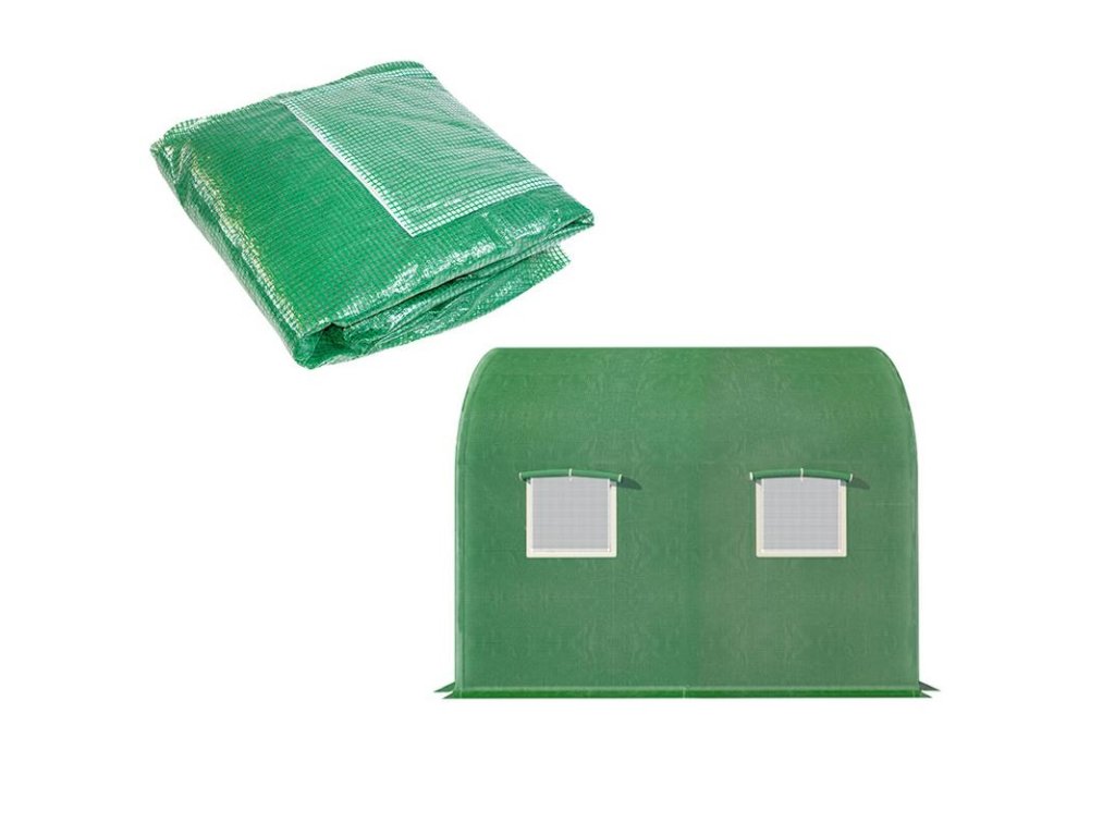 Zelená vrstvená PE fólie 140g/m2. Zelená PP síťovina zabudovaná do struktury fólie ji zpevňuje a chrání před roztržením a mechanickým poškozením. Uzamykatelná okna s moskytiérami umožňují proudění čerstvého vzduchu a regulaci vlhkosti. Tunel je vybaven širokými rolovacími dveřmi se zámkem.