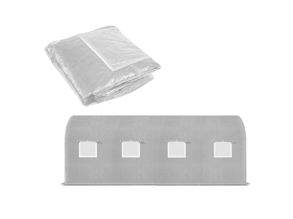 Bílá vrstvená PE fólie 140g/m2. Bílá PP síťovina zabudovaná do struktury fólie ji zpevňuje a chrání před roztržením a mechanickým poškozením. Uzamykatelná okna s moskytiérami umožňují proudění čerstvého vzduchu a regulaci vlhkosti. Tunel je vybaven širokými rolovacími dveřmi se zámkem.