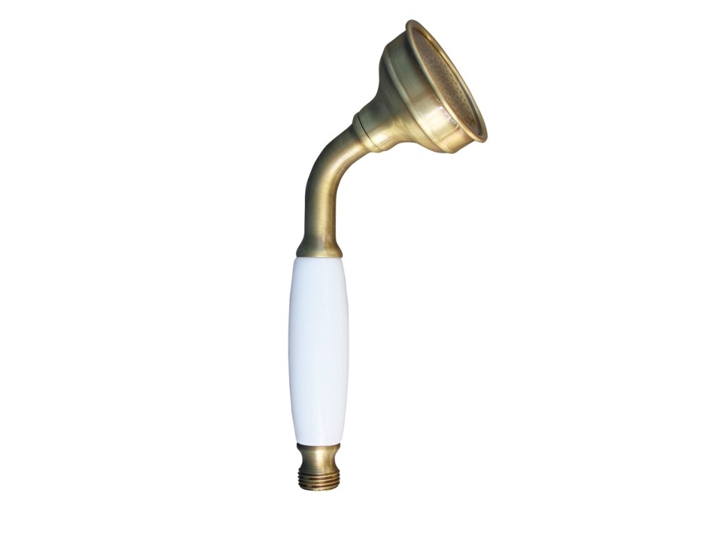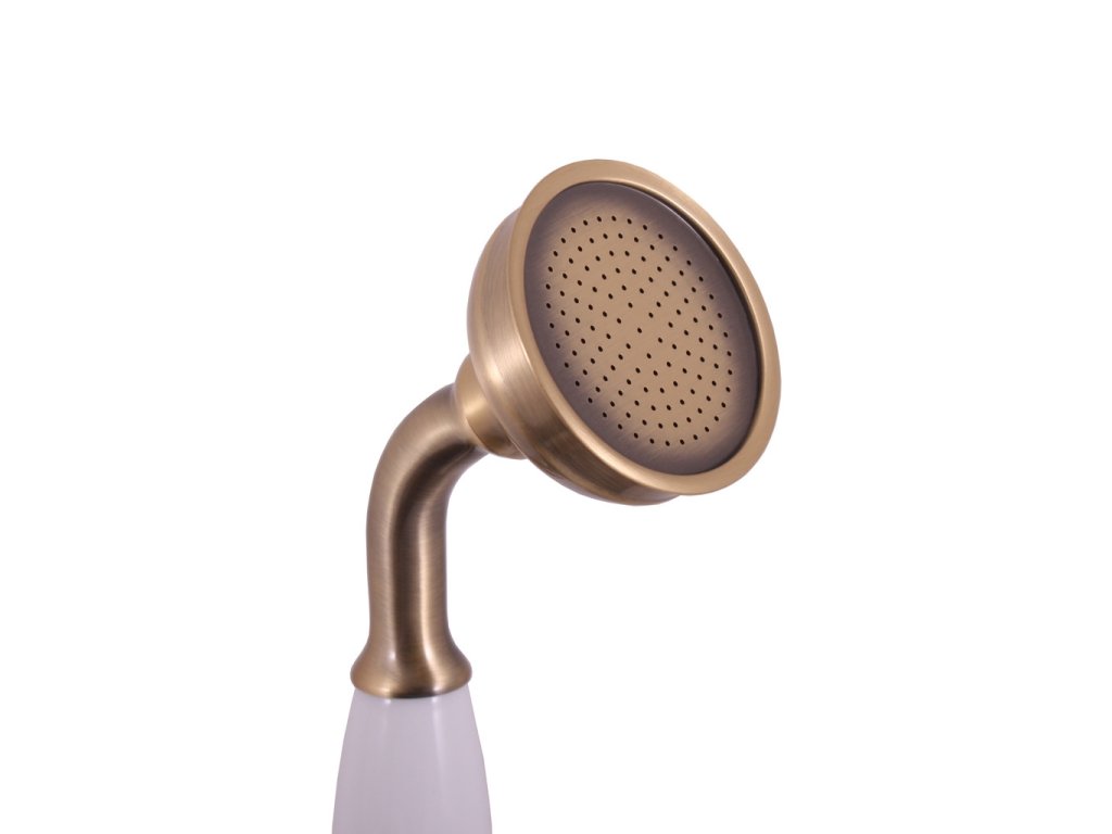 Ruční kovová sprchová růžice v provedení stará mosaz s bílou ručkou.