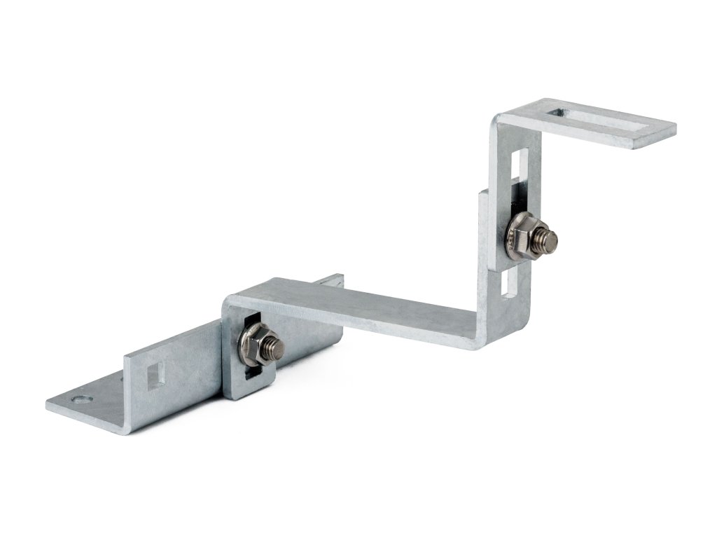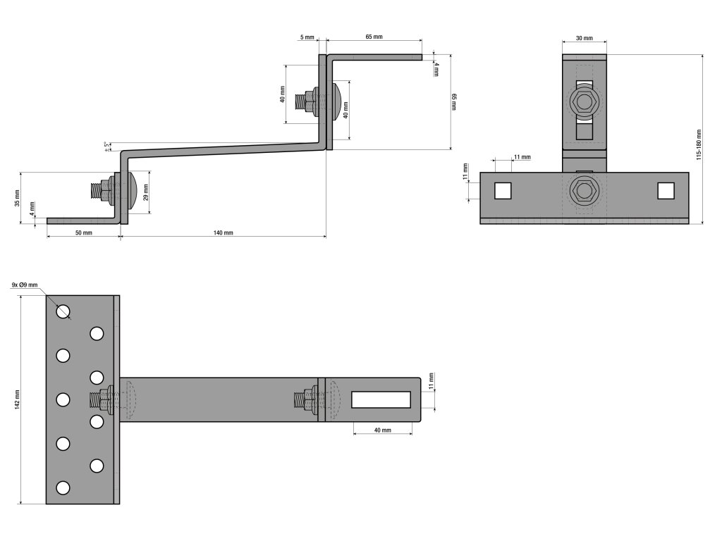 Nastavitelný střešní hák pro kotvení montážních profilů na taškové střechy, 9 otvorů, průměr otvoru 9 mm, rozměry základny s otvory 142 x 35 x 4 mm, rozměry háku 140 x 5 x 30 mm.