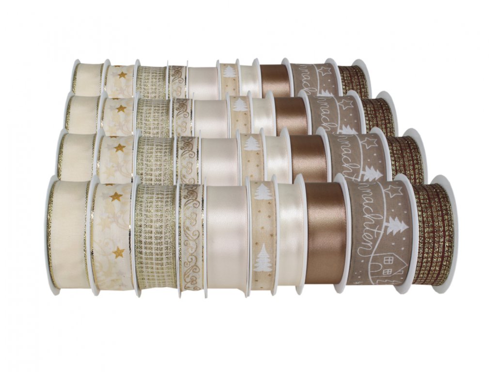 Sada dekoračních stuh na cívce. Stuhy jsou v různých šířkách a odstínech, které se vzájemně dají dobře kombinovat. Vhodné pro období Vánoc. Rozměry: 12x 3m/1,5cm, 24x 2,5m/2,5cm, 4x 2m/4cm. Barvy a motivy: bílá, hnědá, zlaté zdobení, potisk, ornamenty, hvězdy, stromky.
