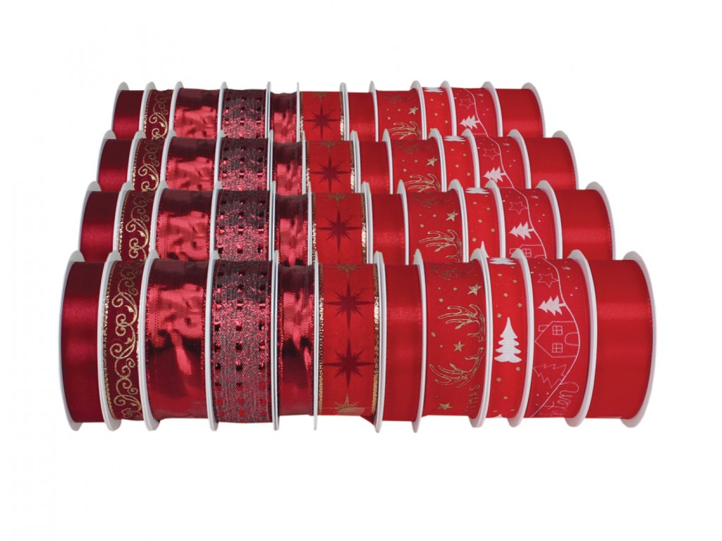 Sada dekoračních stuh na cívce. Stuhy jsou v různých šířkách a odstínech, které se vzájemně dají dobře kombinovat. Vhodné pro období Vánoc. Rozměry: 12x 3m/1,5cm, 24x 2,5m/2,5cm, 4x 2m/4cm. Barvy a motivy: tmavě červená, červená, zlaté zdobení, ornamenty, paroží, hvězdy, stromky.