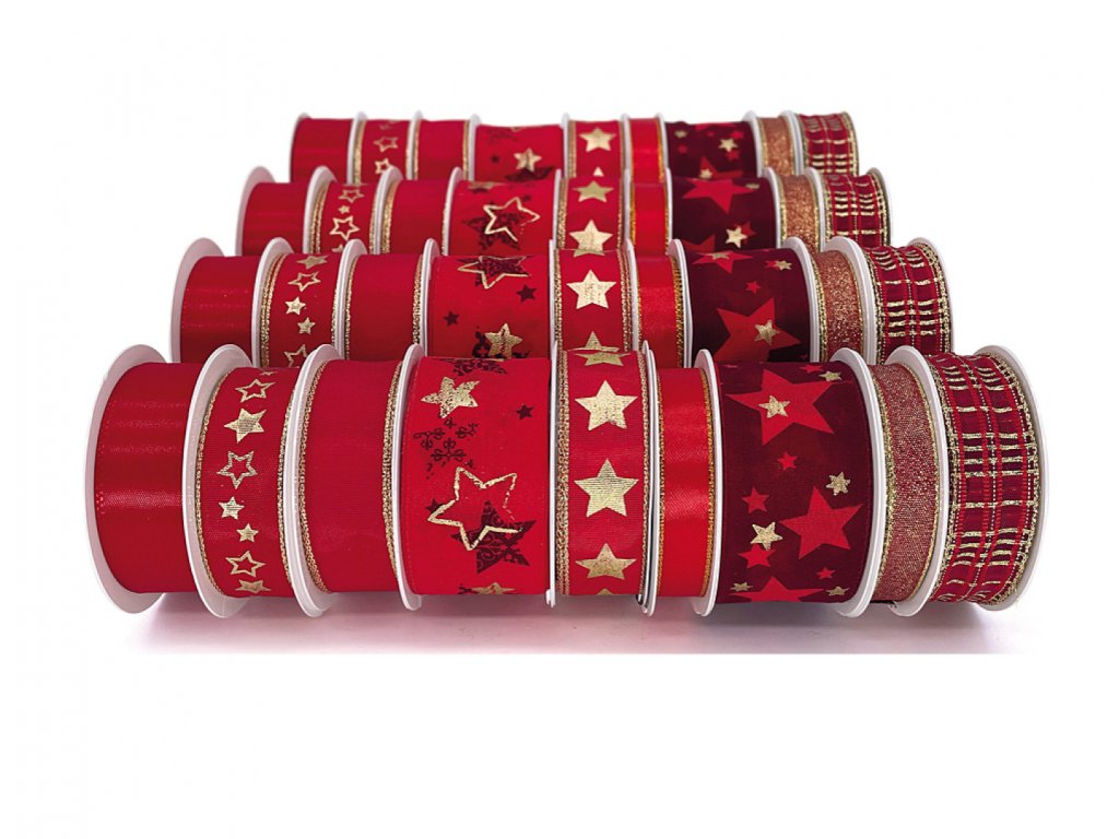 Dekorační látkové stuhy jsou navinuté na plastové cívce. Stuhy mají různé vánoční motivy, jsou v kombinaci červené a zlaté. Rozměry stuh: 8 stuh: délka: 2 m, šířka: 4 cm, 20 stuh: délka: 3 m, šířka: 2,5 cm, 8 stuhy: délka: 4 m, šířka: 1,5 cm.