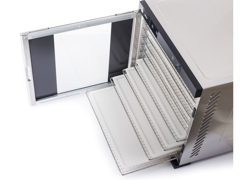 Ale nejen to. Taky křupavou vynikající pizzu, banánové placky, zapékané müsli, cereální lupínky nebo brownies. To vše díky sušícímu tácu e na tekuté suroviny po nastaveném čase vytáhnete ze své sušičky. A s jednou velkou jistotou. Buchty, pečivo, palačinky ani další lahůdky v sušičce nepřipálíte.