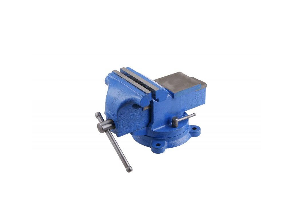 Masivní svěrák s kovadlinkou z litiny, tvrzené čelisti, otáčení svěráku pomocí otočného talíře, tělo a pohyblivé rameno odlité každé z jednoho kusu zaručuje, velkou odolnost a pevnost, váha:7500g, Max. rozevření: 100mm.