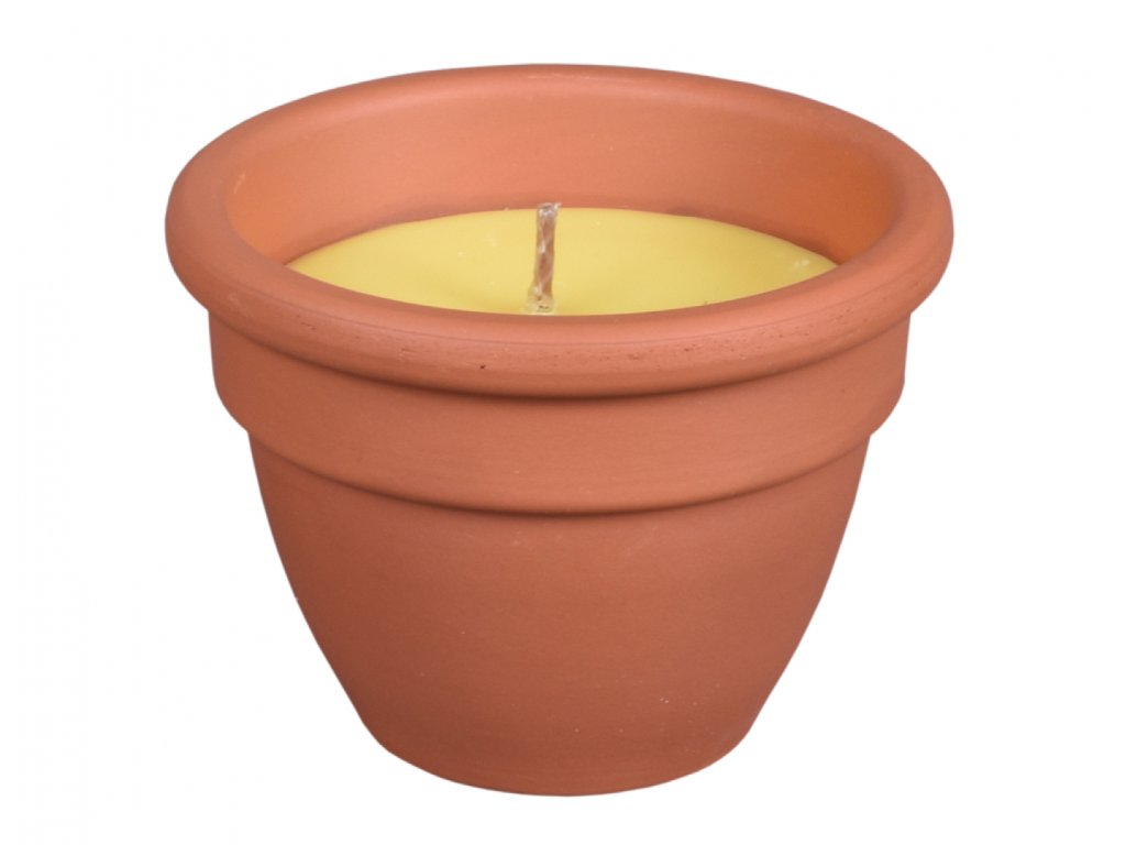 Svíčka s vůní citronelly v kónické keramické nádobě. Citronella je rostlina, která voní člověku, ale silně odpuzuje komáry. Je proto vhodná pro použití při vekovních posezeních apod., kde chceme odpuzovat komáry. Keramická nádoba je zejména ve venkovních prostorech velmi dekorativní. Má jeden knot. Doba hoření: 30 hodin. Průměr nádoby: 9cm, výška 6cm. Hmotnost náplně: 140 g. Brava svíčky: žlutá, barva nádoby: terakota.