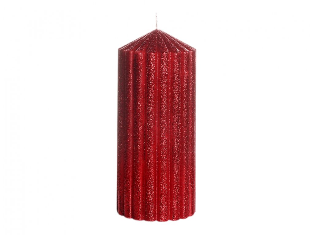 Svíčka ve tvaru válce s vyřezávanými podélnými pruhy. Svíčka je dále zdobena třpytivou povrchovou úpravou. Bude se skvěle vyjímat na vánoční a jiné sváteční tabuli. Rozměry: průměr 7 cm, výška: 16 cm. Barva: červená.