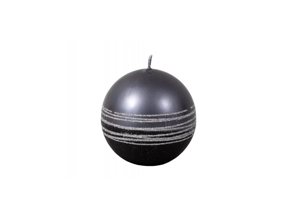 Vánoční svíčka ve tvaru koule napůl černá a napůl tmavě šedá zdobená ve středu stříbrnými glitrovými proužky. Velikost: d8 cm.