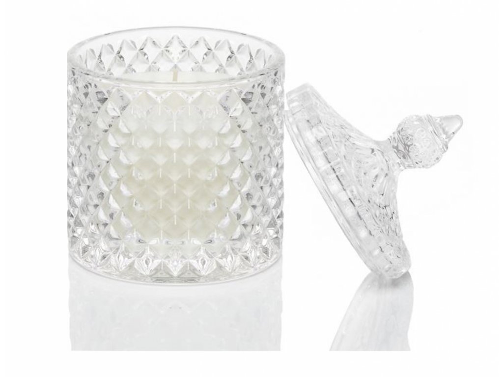 Vonná svíčka ve skle s dekorativním reliéfem připomínající křišťál včetně víčka. Je velice dekorativní a bude se skvěle hodit jako ozdoba do vašeho interiéru. S dřevěným knotem, baleno v krabičce s potiskem. Hmotnost náplně: 180 g.