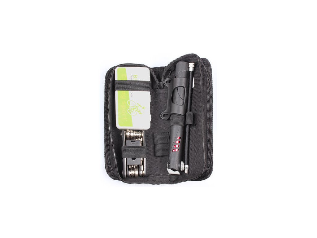 Profesionální sada cyklistického nářadí pro rychlou opravu kola na cestách. V praktickém, voděodolném pouzdře s pásky pro upevnění na rám kola.