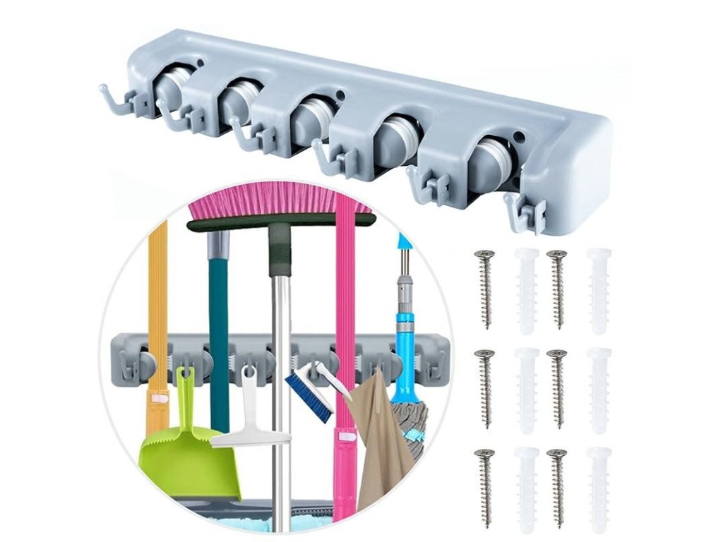 Nástěnný stojan/držák na nářadí a domácí potřeby. Tento produkt je ideální pro organizaci prostoru a pohodlné uložení často používaného nářadí, jako jsou košťata, mopy, hrábě, lopaty atd. Držák má 6 skládacích háčků pro zavěšení malých předmětů, jako jsou klíče nebo kuchyňské utěrky. Specifikace: Rozměry (Š/V/H): 40,5x6,5x11 cm (s rozloženými háčky), 5 přihrádek pro zavěšení většího nářadí (každá o šířce 3,5 cm), šířka nářadí: 1-5-2,8 cm (kladka automaticky nastaví držák na průměr), 6 skládacích háčků pro zavěšení malých předmětů, upevnění pomocí rozpěrných šroubů (hmoždinky jsou součástí balení).