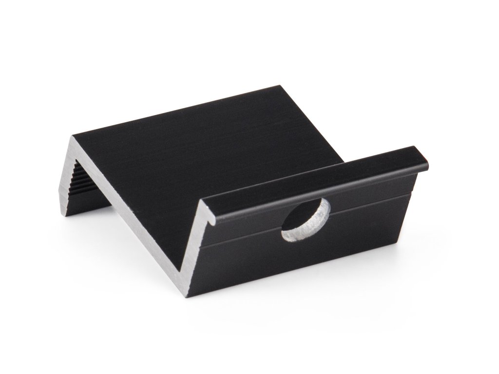 Krajní úchyt panelu, vhodný pro instalaci solárních panelů, určený pro upevnění panelu k hliníkovému profilu, otvor pro šroub M8.