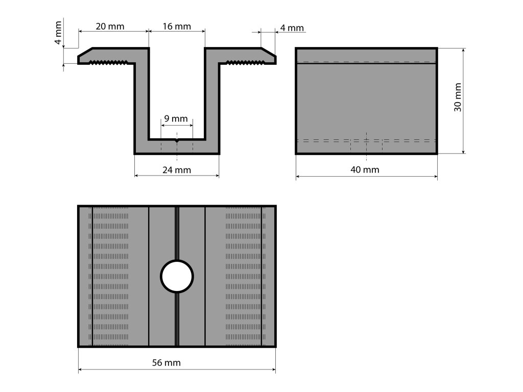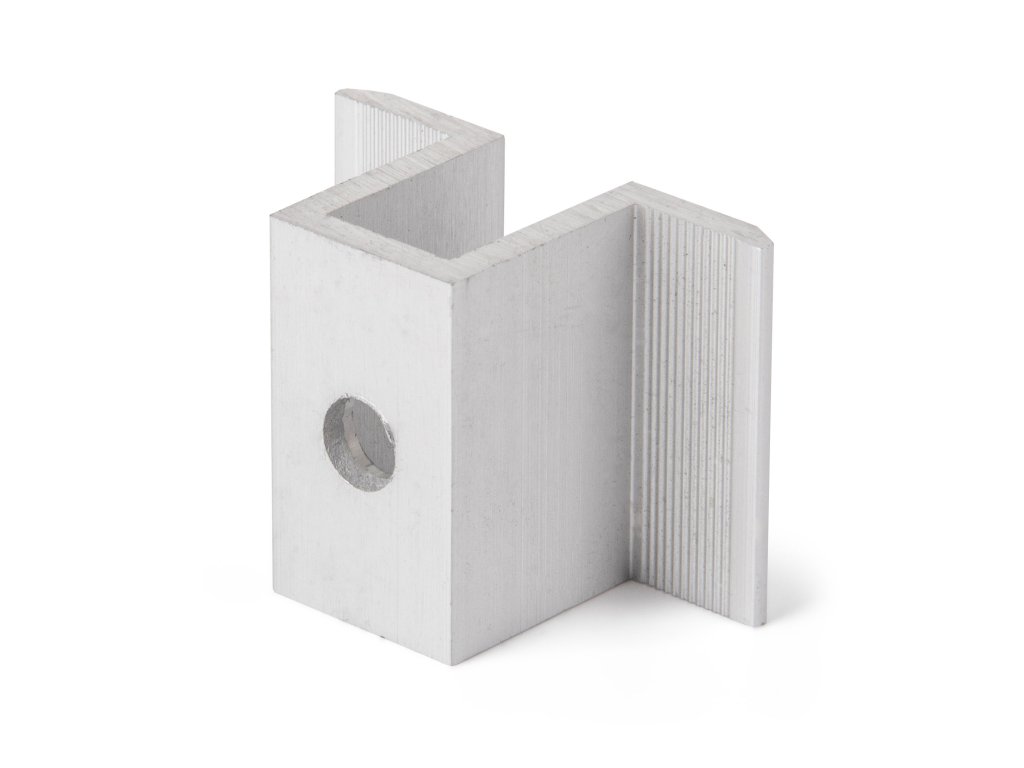 Úchyt je důležitým montážním prvkem pro instalaci solárních panelů a používá se k upevnění panelu k hliníkovému profilu. Je z odolného hliníku 6063 o rozměrech 5,5 x 3 x 4 cm s otvorem M8. Úchyty je možné zakoupit v balení po 200 kusech.