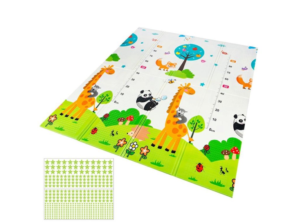 Velká hrací podložka pro děti o rozměrech 180x160cm. Tato podložka může s úspěchem nahradit koberec a sloužit jako zajímavý dekorativní prvek v dětském pokoji. Specifikace: - Materiál: XPE pěna - Rozměry: 180x160cm - Tloušťka: 10mm - Vynikající izolace od země - Stimuluje psychomotorický vývoj dítěte - Pomáhá s učení se lezení - Polštáře pádů - Oboustranná - potisk na obou stranách podložky. 2 listy samolepicích světélkujících hvězd jsou součástí balení ZDARMA! Podložku lze použít uvnitř i venku. Rozměry balení: 91x9x43cm Množství na paletě: 51