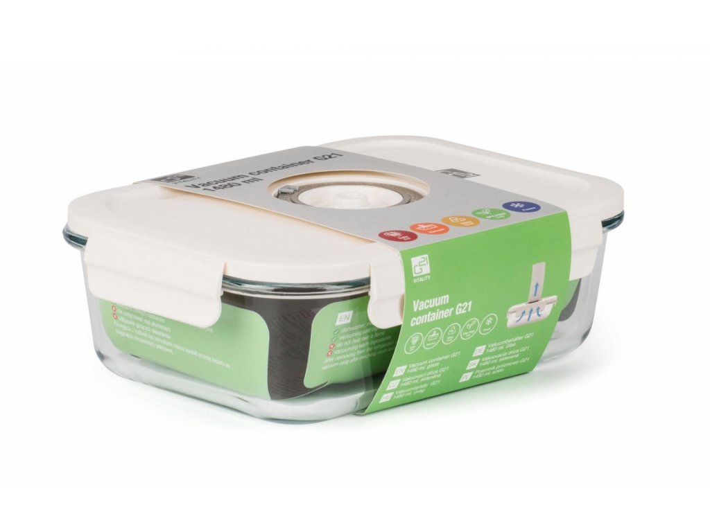 Pro pohodlné a snadné vakuování čerstvých i hotových potravin doporučujeme vynikající vakuovací dózu G21 s objemem 1 480 ml. Prodlouží trvanlivost potravin, zachová jim čerstvost i plnou chuť a vůni a především všechny zdraví prospěšné látky. Velkou výhodou této dózy je její široké využití – potraviny v ní po zavakuování můžete uložit do ledničky, zamrazit nebo po sundání víka rovnou zapékat v troubě či horkovzdušné fritéze.