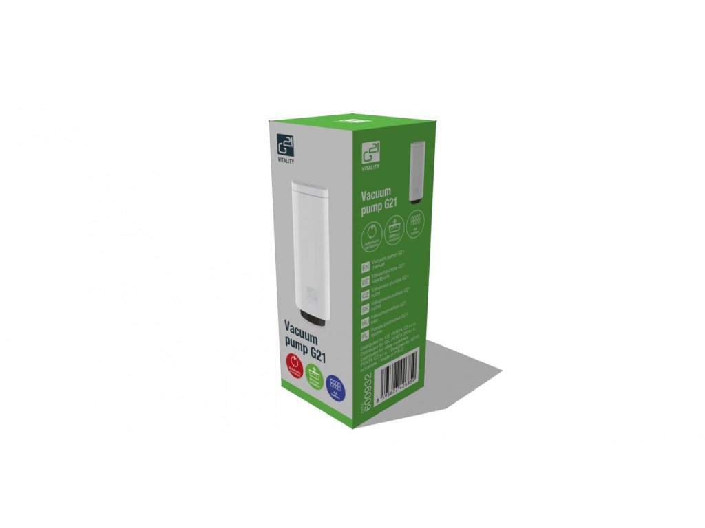 Vakuovací pumpa G21 je malá, nenáročná na místo a téměř bezúdržbová – po vypnutí ji otřete jemným hadříkem a uložíte pryžovou částí směrem dolů. Napájení čtyřmi AA bateriemi vám umožňuje vakuovat kdekoliv, aniž byste byli závislí na elektrické síti.