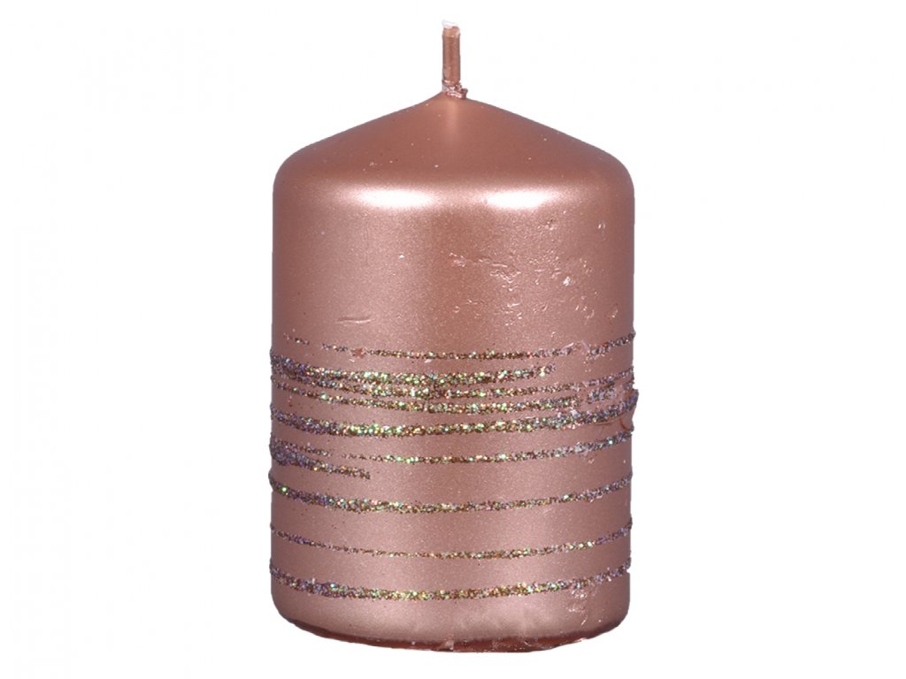 Svíčka ve tvaru válce. Má hladký, lesklý povrch zdobený jemnými třpytivými proužky. Jemně podtrhne vánoční vazby a výzdobu. Doba hoření: 30 hodin. Rozměry: průměr 6 cm, výška 9 cm. Barva: měděná.