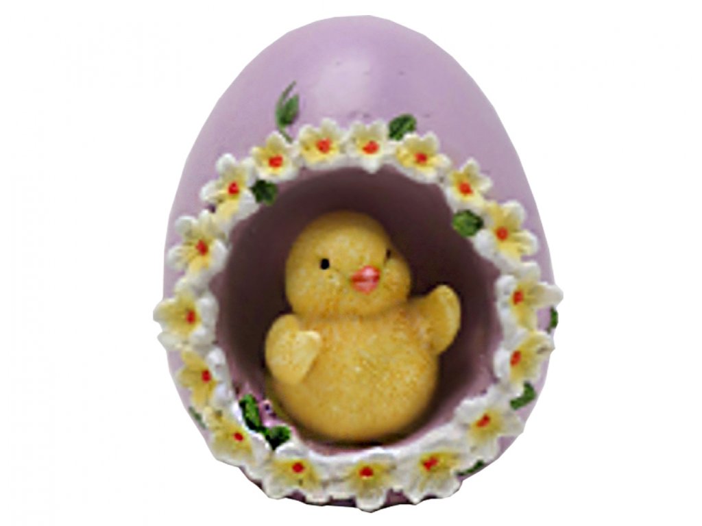 Dekorace v podobě velikonočního kuřete v kraslici. Je vyrobena z polyresinu, který vyniká svojí odolností, což ho předutčuje být vhodným materiálem pro různé povětrnostní podmínky. Vhodná do interiéru i exteriéru. Rozměry: délka 8 cm, hloubka 8 cm, výška 10 cm. Barva: mix barev, fialová skořápka.