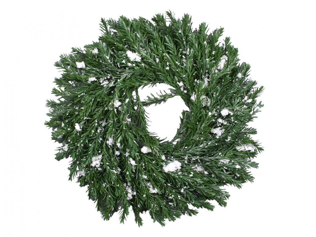 Vánoční věnec je ozdoben zelenými větvičkami s imitací sněhové pokrývky. Je vhodný nejen k zavěšení na dveře a na zeď, ale také k dekoraci na stůl. Průměr: 35 cm.