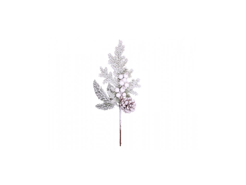 Větvička VÁNOCE ojíněná s bobulemi a šiškou 43cm