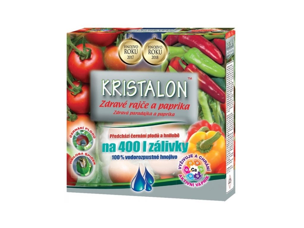 Kristalon Zdravé rajče a paprika je dvousložkové hnojivo, které účinně dodává potřebné živiny a zabraňuje jejich vzájemnému zablokování. Je zdrojem všech základních živin potřebných ke zdravému vývinu plodů rajčat i paprik. Je účinnou prevencí proti černání plodů rajčat a hnilobě konců paprik. Vápník je účinnou prevencí proti hnilobě konců paprik a plodů rajčat Bohatý zdroj rychle přijatelného vápníku (26,5 % CaO).