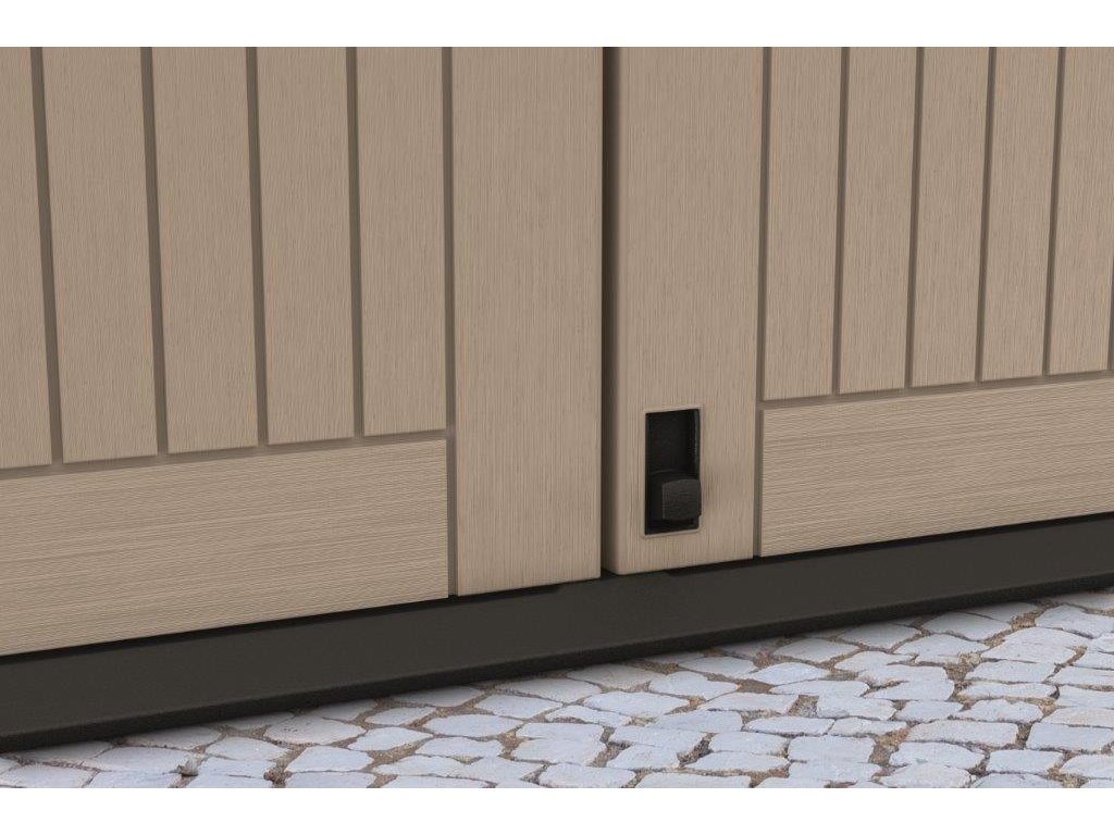 Uzamykatelný a vysoce odolný přístřešek na popelnice, zahradní nářadí a další příslušenství, zešikmený práh pro kontejnery s kolečky, 880 l kapacita, možnost instalace poliček, z kvalitního materiálu odolného vůči horšímu počasí, béžová a hnědá barva.