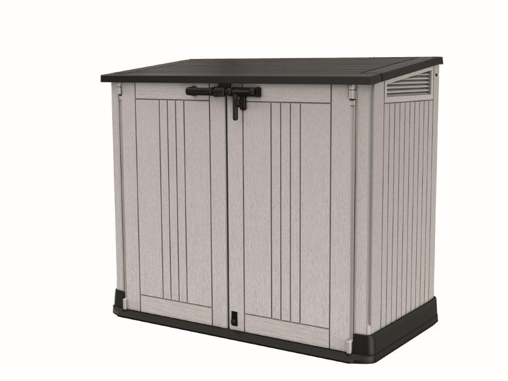Uzamykatelný a vysoce odolný přístřešek na popelnice, zahradní nářadí a další příslušenství, zešikmený práh pro kontejnery s kolečky, 880 l kapacita, možnost instalace poliček, velice kvalitní materiál, šedá barva.