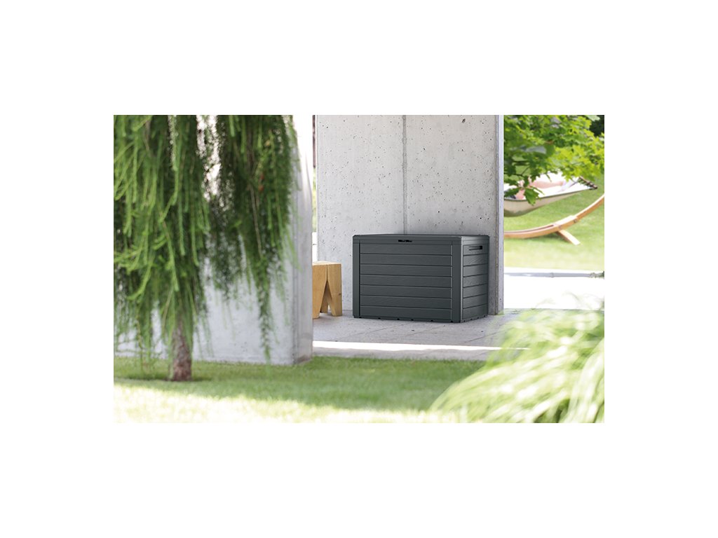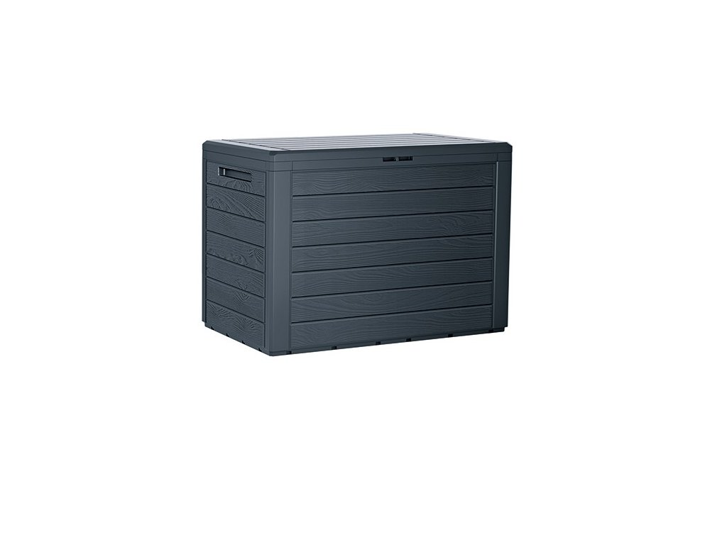 Zahradní box Woodebox značky Prosperplast představuje praktického pomocníka do venkovních prostor. Díky svému dřevěnému designu bude ozdobou vaší zahrady, terasy nebo balkónu. Jeho antracitová barva působí příjemně na pohled. Uschovejte do boxu s odvětráváním vše potřebné od dětských hraček po deky a polštáře. Lze ho zabezpečit i visacím zámkem a zamknout cennější věci uvnitř. Sestavení boxu zvládne každý. Jednotlivé části boxu se zacvakají do sebe, takže vám jeho sestavení nezabere moc času a nebudete potřebovat ani žádné nářadí. Na bočních stranách boxu se nacházejí madla pro snadné přenášení. Víko boxu je odklápěcí pomocí plastových pantů.