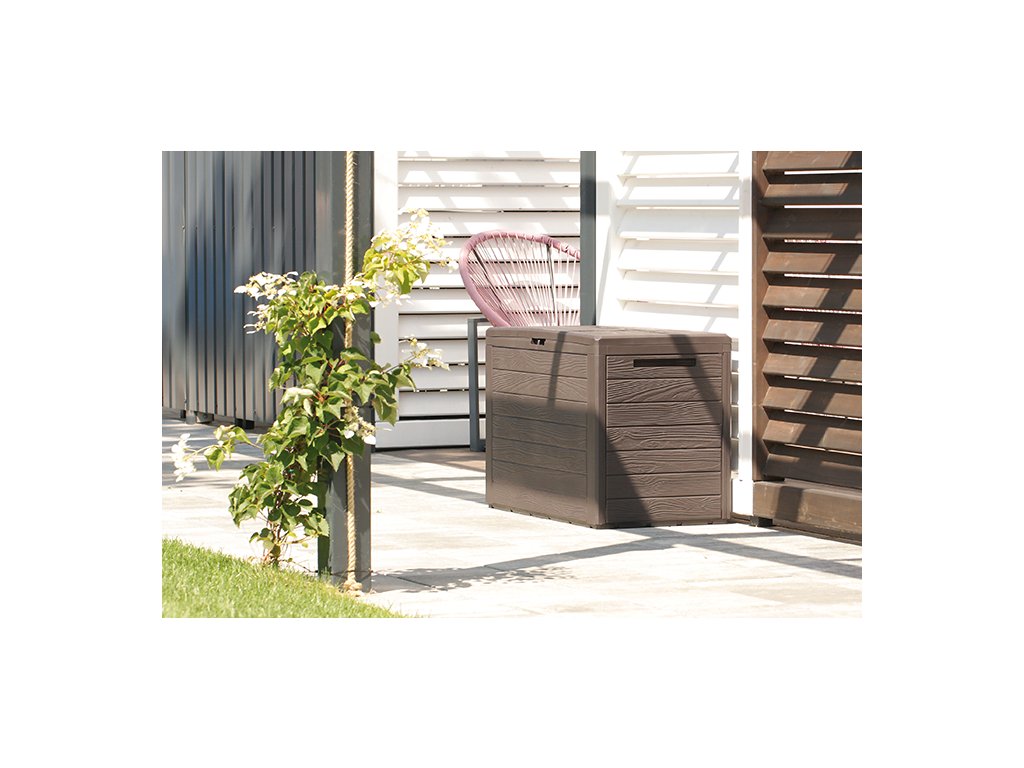 Zahradní box Woodebox značky Prosperplast představuje praktického pomocníka do venkovních prostor. Díky svému dřevěnému designu bude ozdobou vaší zahrady, terasy nebo balkónu.. Jeho hnědá barva působí příjemně na pohled. Uschovejte do boxu s odvětráváním vše potřebné od dětských hraček po deky a polštáře. Lze ho zabezpečit i visacím zámkem a zamknout cennější věci uvnitř. Sestavení boxu zvládne každý. Jednotlivé části boxu se zacvakají do sebe, takže vám jeho sestavení nezabere moc času a nebudete potřebovat ani žádné nářadí. Na bočních stranách boxu se nacházejí madla pro snadné přenášení. Víko boxu je odklápěcí pomocí plastových pantů.
