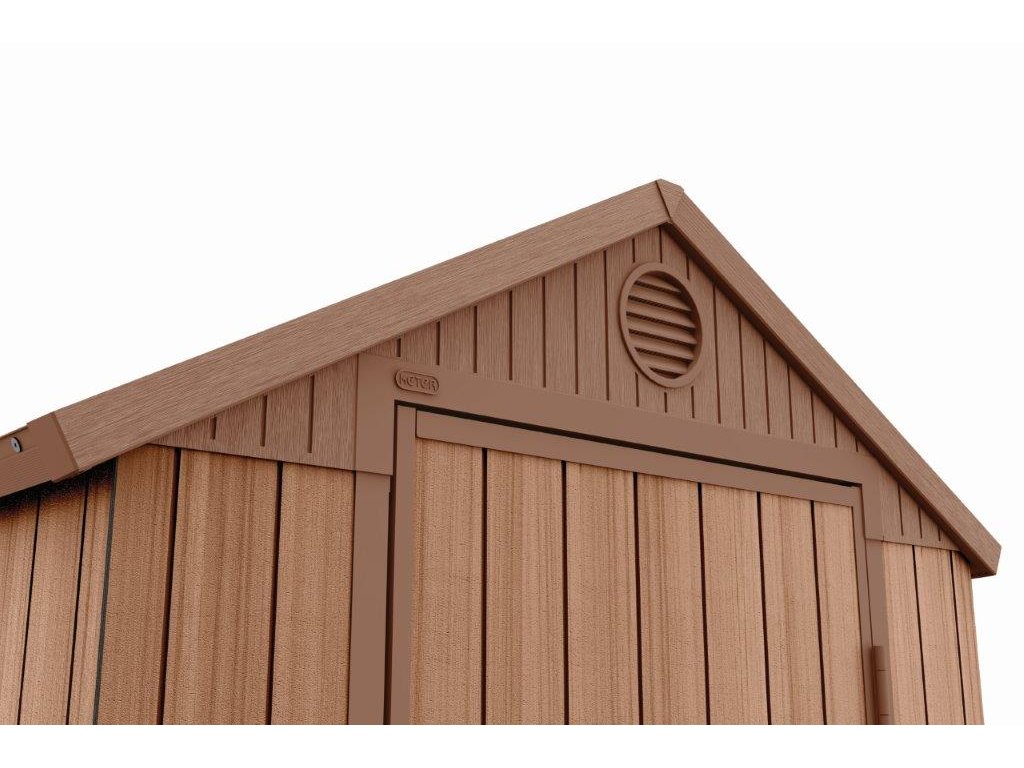 Zahradní domek Keter Darwin je vybavený silnou sedlovou střechou, která vydrží zatížení až do 75 kg/m², takže hravě odolá i haldě sněhu. Má jednoduché dveře i malé okénko, skrze které se dovnitř dostane sluneční svit. Výrobce se také postaral o vhodný ventilační systém s regulovanou cirkulací vzduchu. Přední dveře jsou opatřeny ocelovou západkou, na kterou lze nasadit visací zámek pro větší bezpečnost.