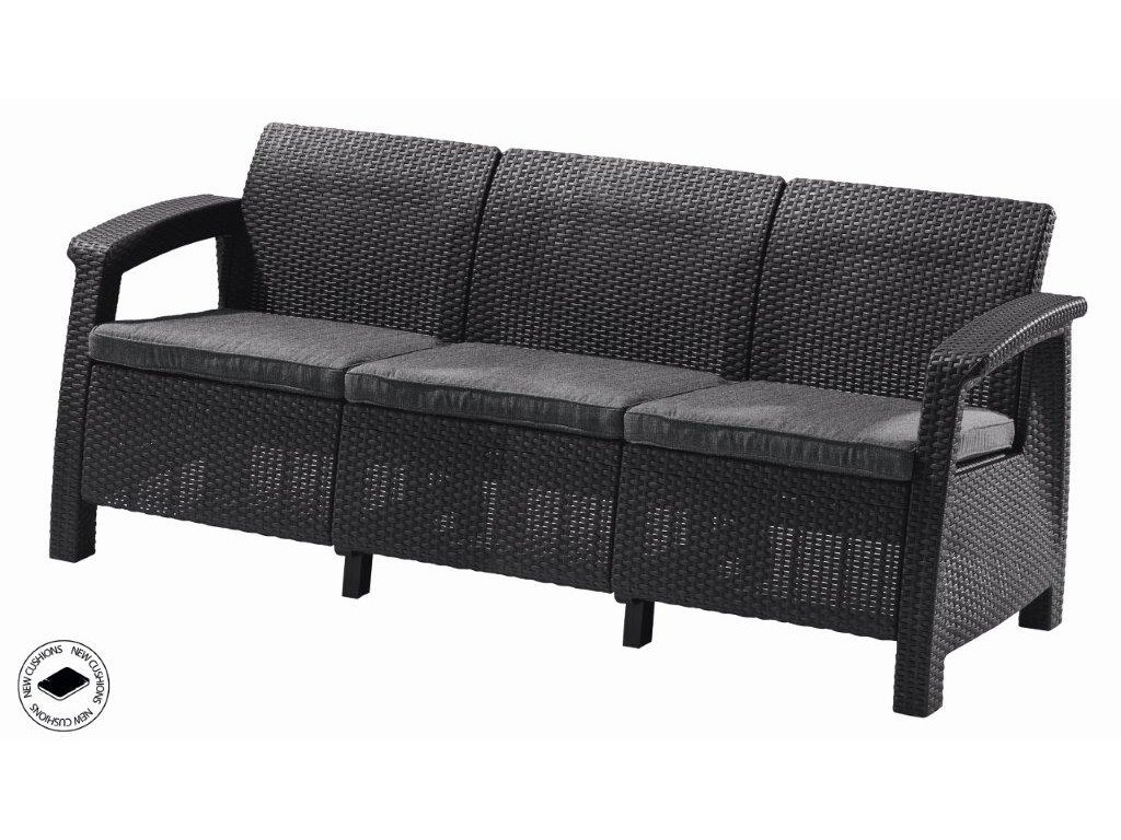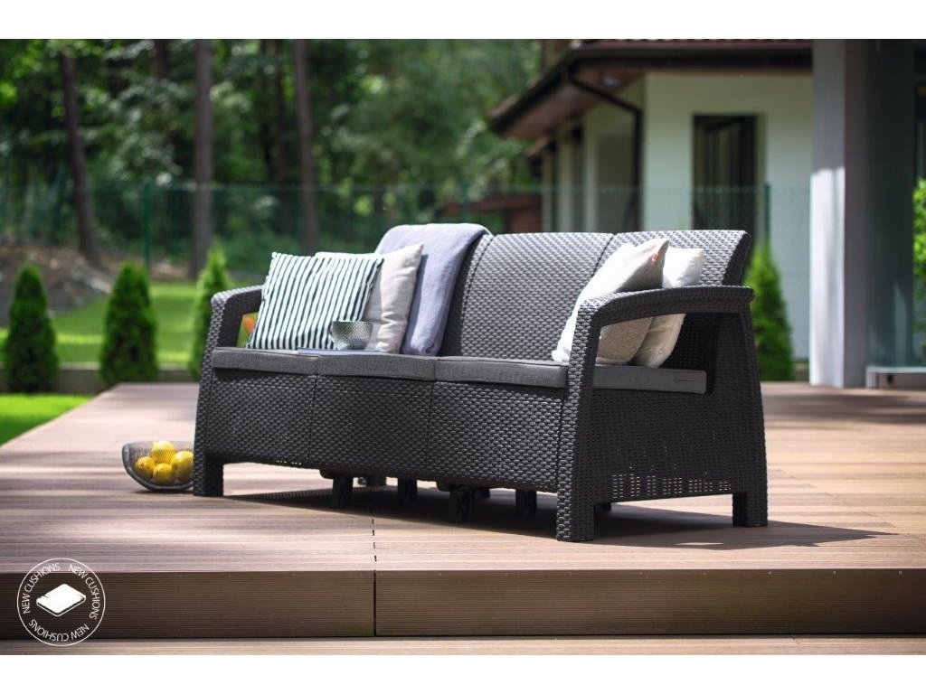 Zahradní trojmístná pohovka z řady Corfu je nejoblíbenější z řady nábytku Keter, která vás nadchne svým nevšedním designem v imitaci přírodního ratanu. Konstrukce je přitom pevná a vydrží běžné zatížení venkovního provozu.