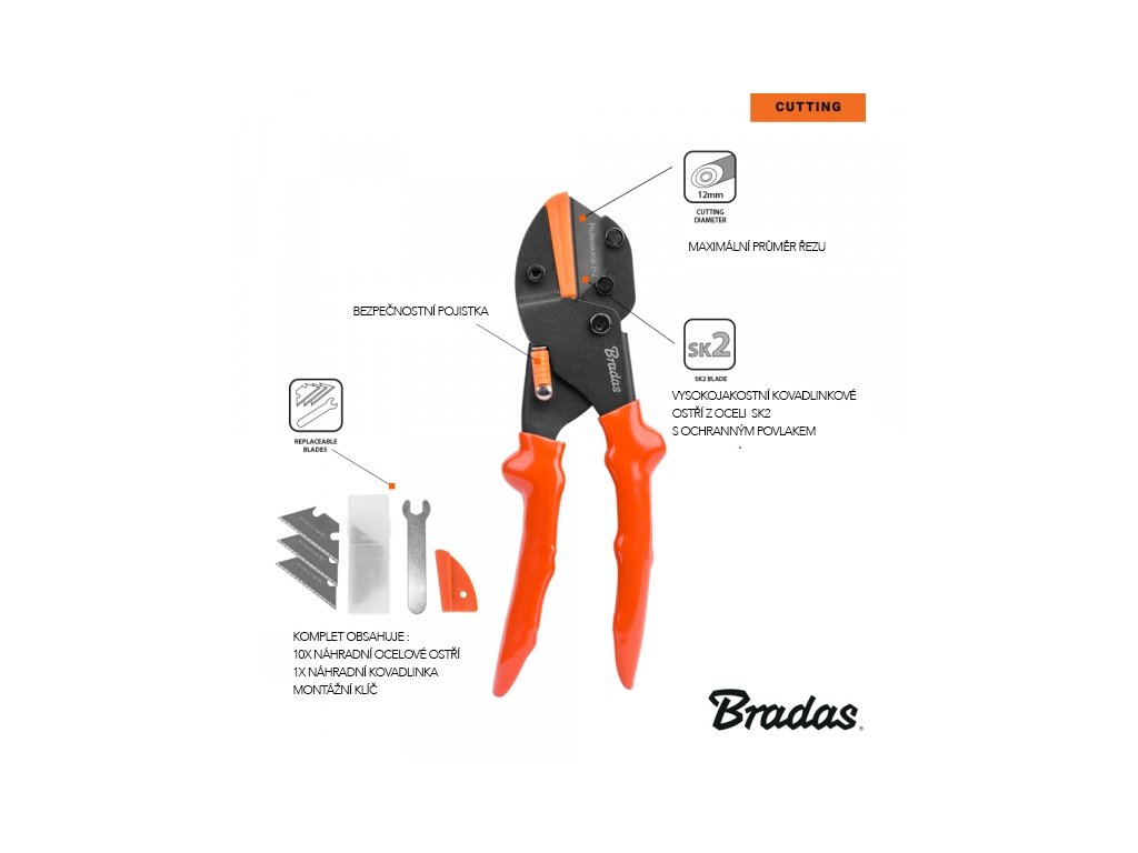 Zahradnické nůžky s výměnými čepelemi s průměrem řezu až 12 mm. Čepel z nerezové oceli je pokryta ochrannou vrstvou. Vybavené ergonomicky tvarovanou rukojetí a bezpečnostním zámkem proti otevření. Ideální pro řezání květin a keřů, kabelů, hadic, papírů.