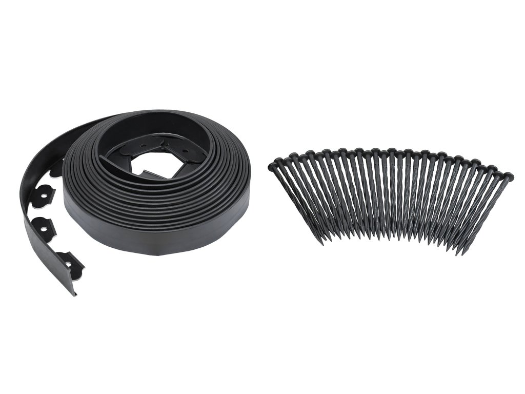 V základním balení najdete vše. Jak obrubník o délce 10 m, tak i 30 hřebů pro po spolehlivé uchycení neviditelného obrubníku k zemi. Na spodní straně obrubníkového pásu jsou otvory, do kterých vložíte přiložené hřeby a zatlučete je.
