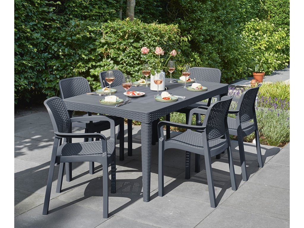 Zahradní stůl je důležitý v každé zahradě. Nevšední design zahradního stolu Girona bude pro Vaši zahradu to pravé. Má nádherný, jemně strukturovaný povrch z rezolitu, ale také oblé proutěné detaily, které mu dodávají jedinečný vzhled. Stůl je vyroben z odolných materiálů, které mu dodávají krásný vzhled a stálou barvu. V první řadě nevyžaduje prakticky žádnou údržbu, stačí ji otřít vlhkým hadříkem a je hotovo.
