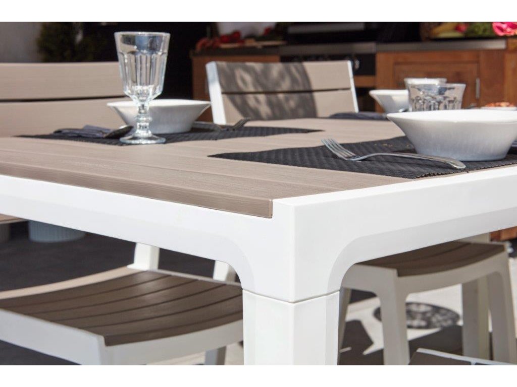 Harmony stůl s bílým rámem a hnědými prkny připomínajícími dřevo tvoří dokonalý pár s pohodlnými židlemi stejné řady. Nekovový rám je odolný vůči rzi a je zárukou snadné údržby. Konstrukce z umělé pryskyřice. Bílá a kapučínová barva.