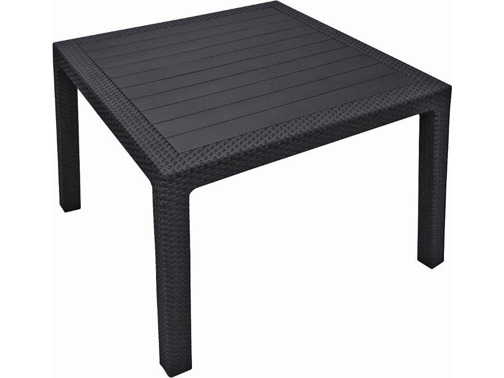 Praktický a elegantní stůl 95 x 95 cm s imitací přírodního ratanu grafitové barvy. Vhodný pro menší prostory, do interiéru i exteriéru. Je vyroben z kvalitních materiálů odolných vůči nepřízni počasí i UV záření.