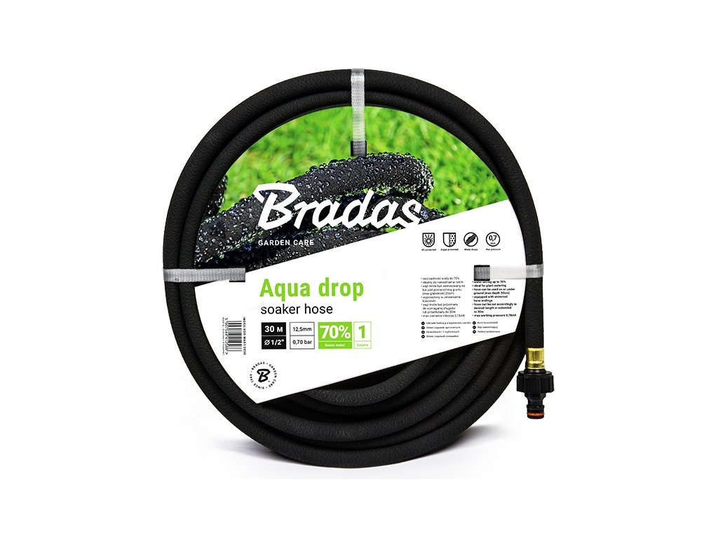 Zajišťuje přesné a vysoce efektivní zavlažování. AQUA-DROP - je vyrobená z vysoce kvalitního kaučuku, který zajišťuje rovnoměrné pronikání vody po celém povrchu. Představuje úsporu vody až o 70 %. Hadice je osazena rychlospojkami pro snadné připojení. Hadice AQUA DROP může být umístěna pod mulčovací kůrou nebo pod zeminou v hloubce až 20 cm. Hadice je ideálním řešením pro přesné a efektivní zavlažování rostlin.