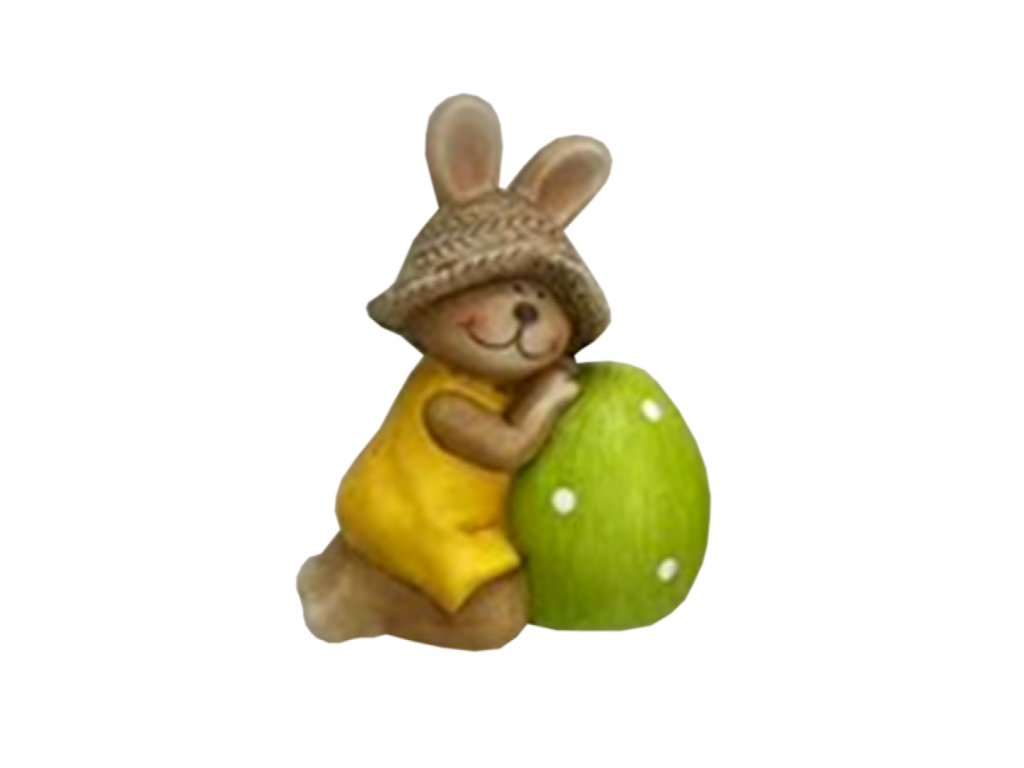 Dekorace v podobě zajíce se zelenou kraslicí. Vhodná do interiéru i exteriéru. Vhodná sezóna: jaro, velikonoce. Materiál: terakota. Rozměry: šířka 11 cm, hloubka: 7 cm, výška: 14 cm. Barva: mix barev.