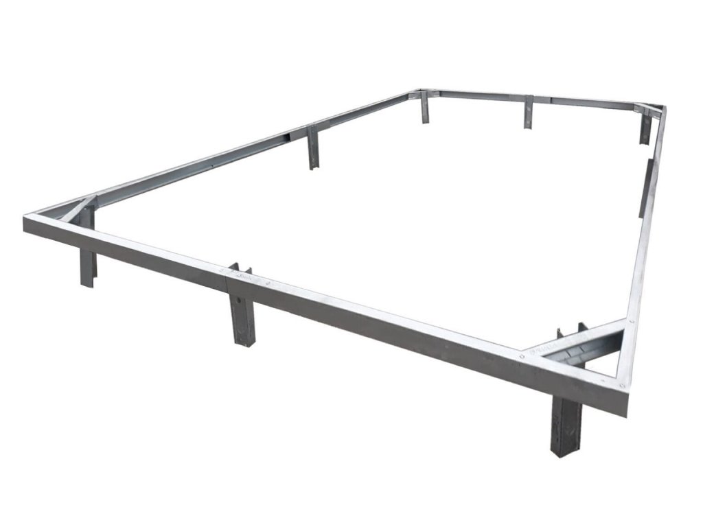 Konstrukce základny skleníku z pozinkované oceli určená pro skleníky dlouhé 6 m a široké 2 m.