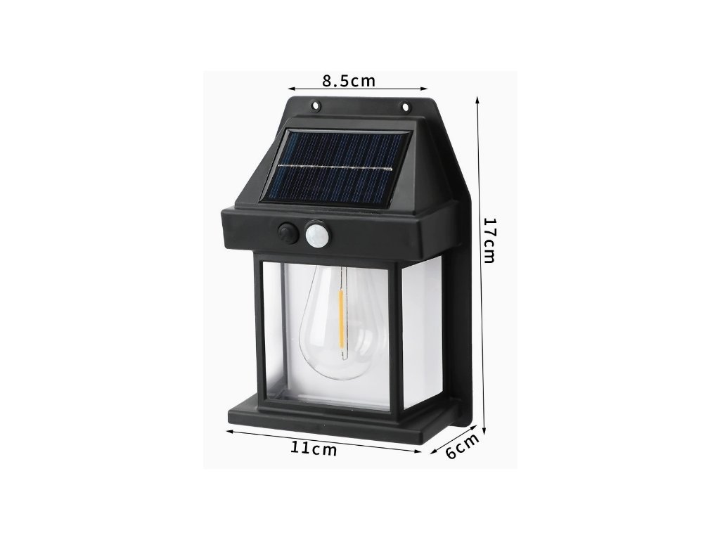 LED solární lampa ve formě nástěnné lampy – ideální pro osvětlení vaší zahrady, terasy, balkonu nebo fasády domu. Je vybavena solárním panelem, senzorem pohybu a senzorem soumraku, pracuje bezdrátově a automaticky se zapne po setmění. Retro styl s LED žárovkou E27 dělá z nástěnné lampy dekorativní i praktickou součást. Snadná instalace bez kabelů – jednoduše zavěste na zvolené místo.