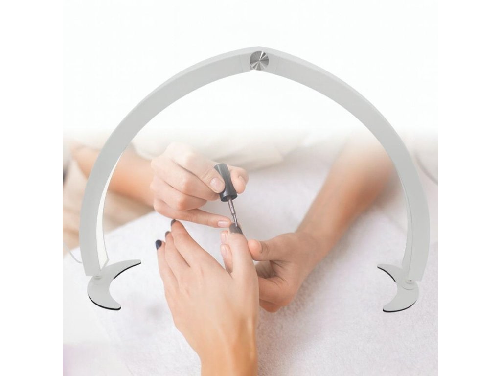 Tato skládací LED lampa ve tvaru půlměsíce je perfektním řešením osvětlení pro manikúru, kosmetické procedury a precizní práci. Dálkové ovládání umožňuje nastavit jas a teplotu barev od 3200 K do 5600 K. Dálkovým ovladačem, který je součástí dodávky, můžete navíc světlo na dálku stmívat a zesvětlovat.