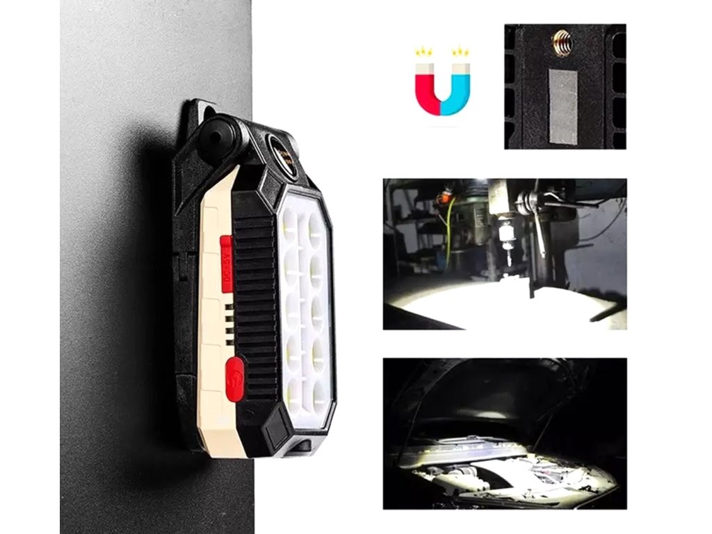 Spolehlivá, svítící DIY LED lampa vybavená silnými COB LED diodami - nenahraditelná v dílnách a službách nebo v garážích pro kutily. Vybaveno praktickým fyzickým vypínačem s regulací výkonu světla a vestavěnou baterií, která výrazně usnadňuje osvětlení pracovního prostoru mimo zásuvku. LED kontrolky indikují úroveň nabití baterie. Kompaktní provedení je vybaveno silným magnetem, který umožňuje připevnění svítilny na kovový povrch. Svítilna má navíc v horní části přídavné madlo, díky kterému ji můžete snadno zavěsit na zeď.