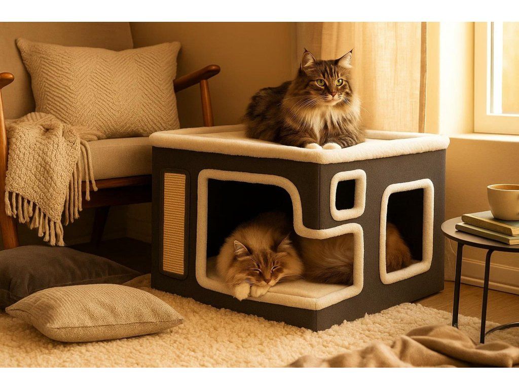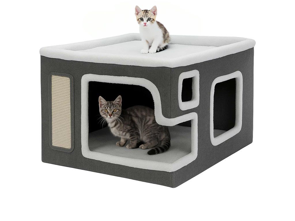 Przestronny domek dla kotów z dwoma poziomami to idealne miejsce dla dwóch pupili – do zabawy, drapania i odpoczynku. Posiada miękką powierzchnię do leżenia na górze, sizalowe panele do drapania oraz wewnętrzne legowisko z kilkoma wejściami. Wyposażony w wiszącą zabawkę dla dodatkowej rozrywki. Estetyczny design i solidne wykonanie sprawiają, że świetnie wpasuje się w każde wnętrze.